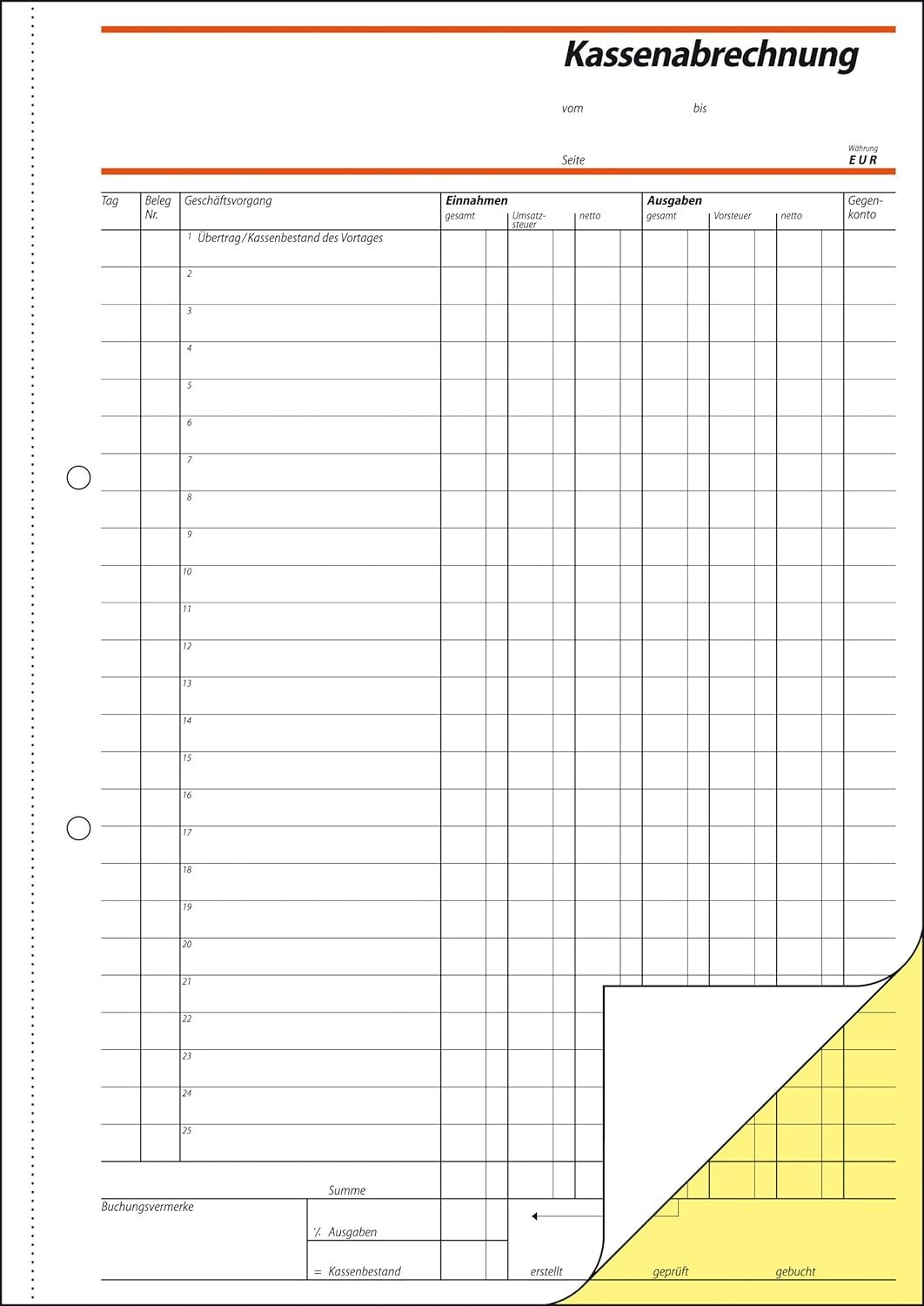 Kassenabrechnung, Format A4 - praxisorientierte Einteilung, geeignet für die Einzelerfassung von Brutto-, Netto- und